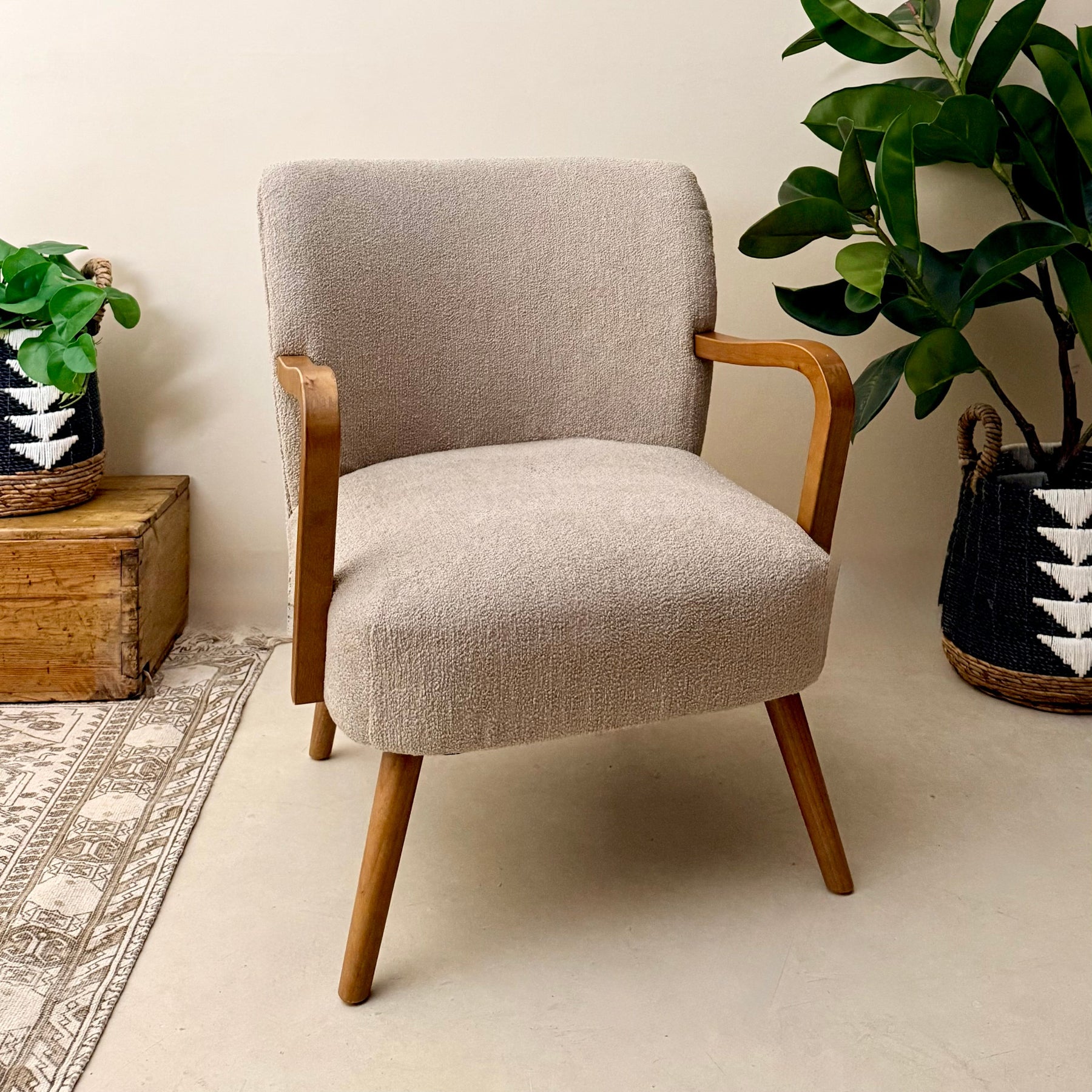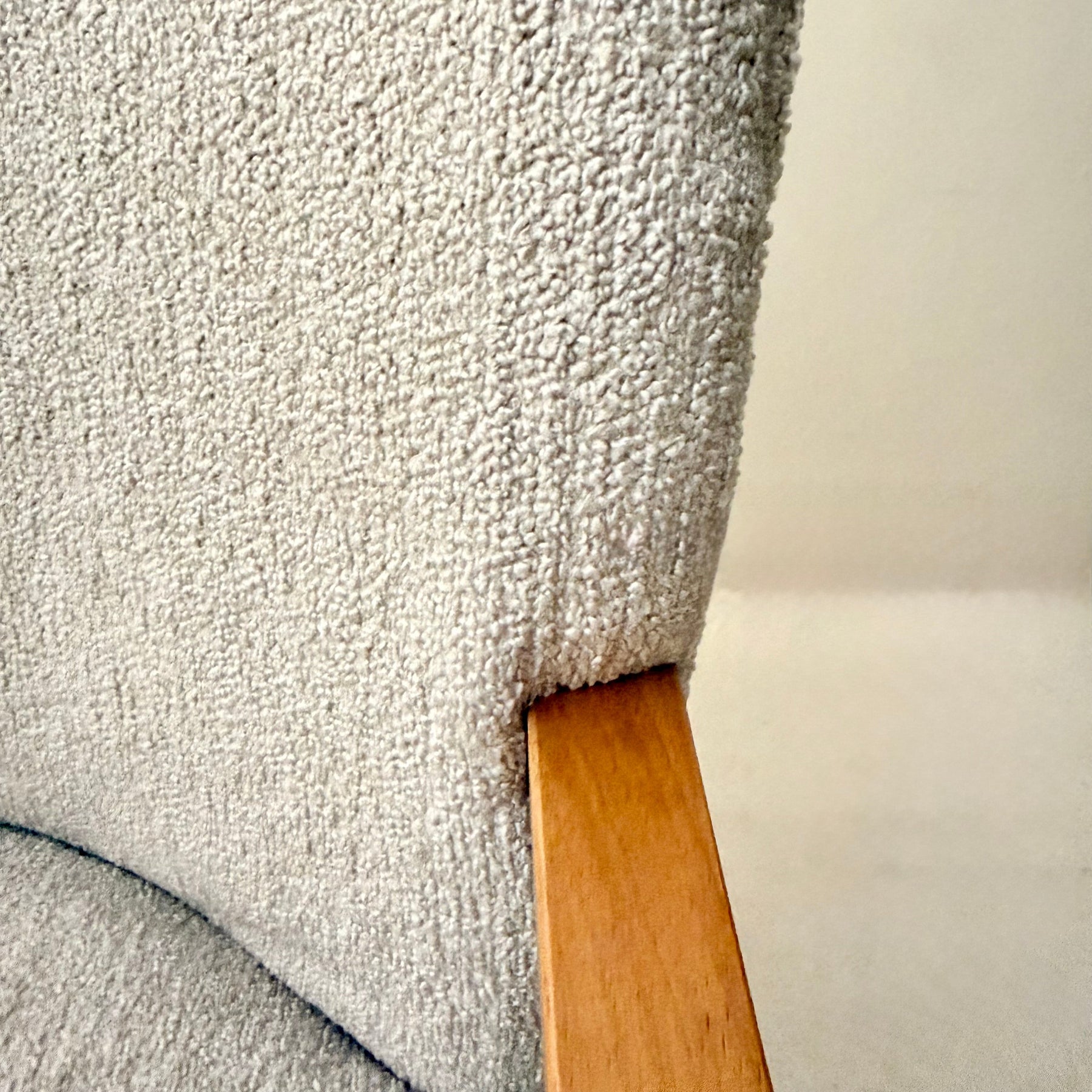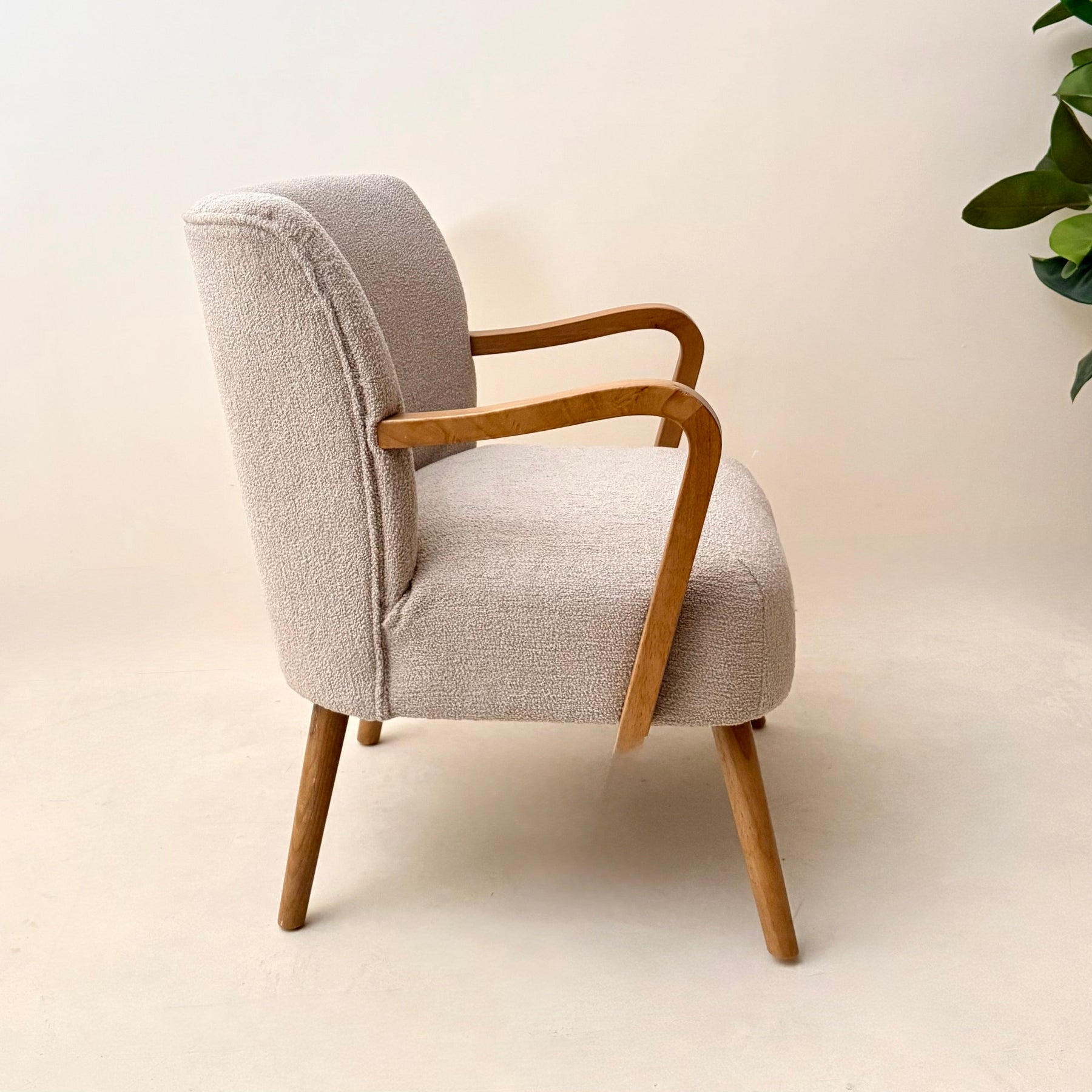 Taupe Boucle upholstery with solid sustainable rubberwood arms and legs.