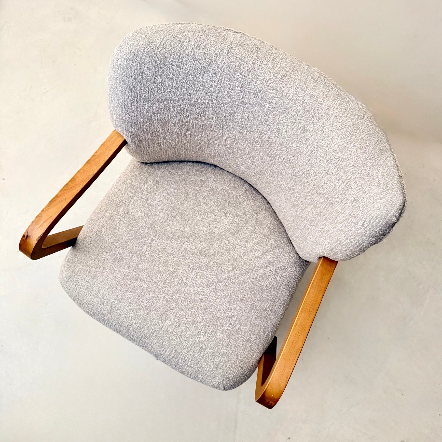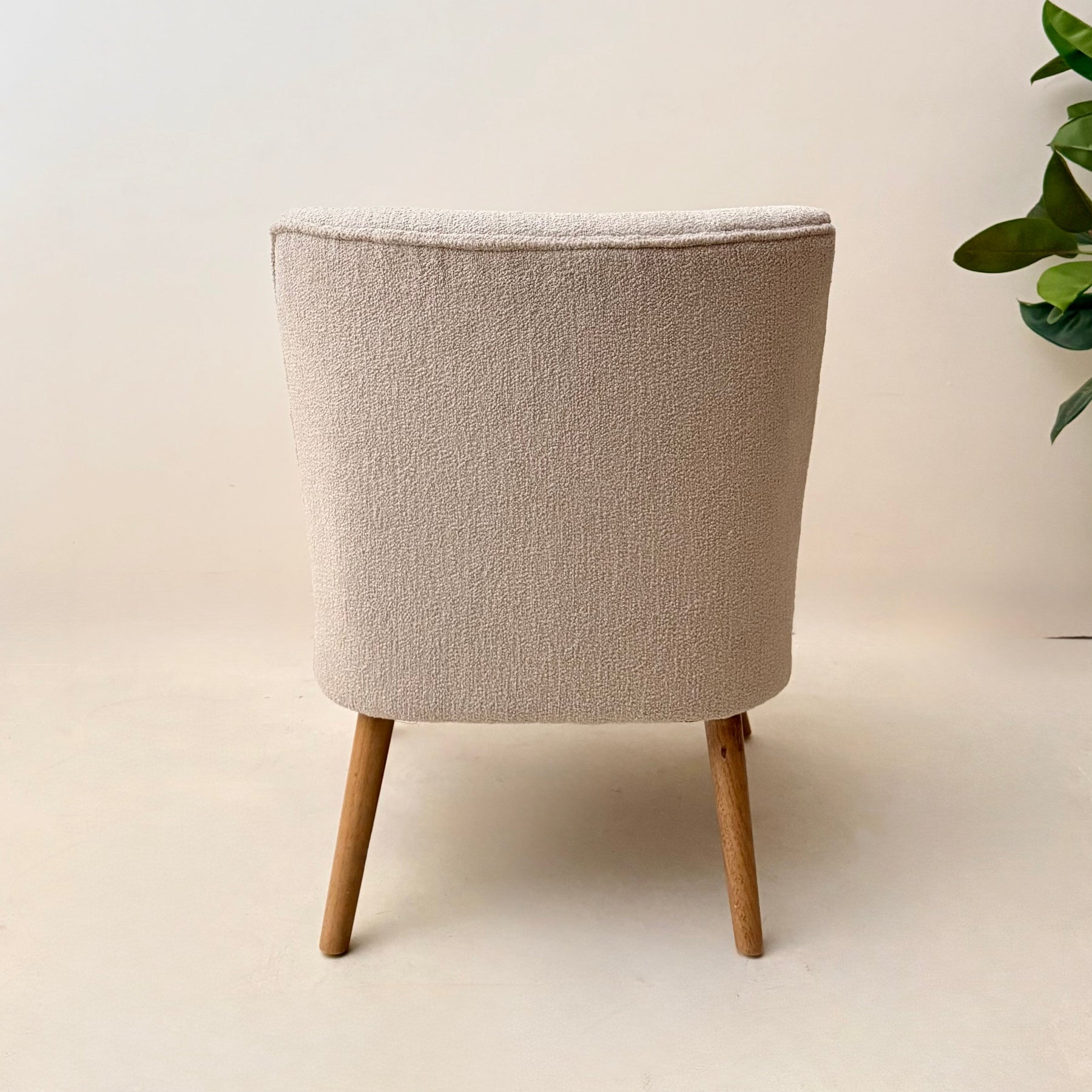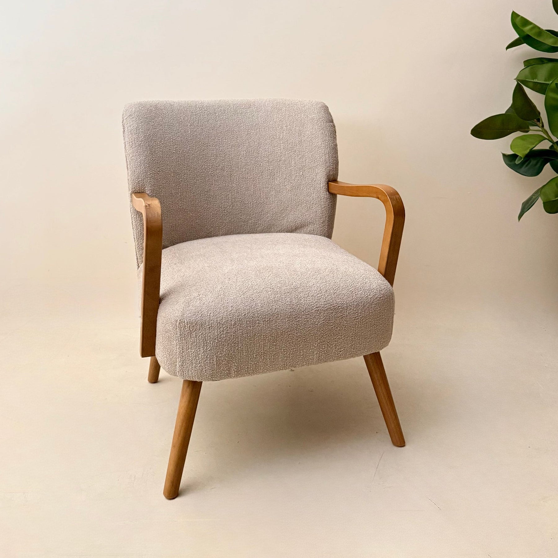 Taupe Boucle upholstery with solid sustainable rubberwood arms and legs.
