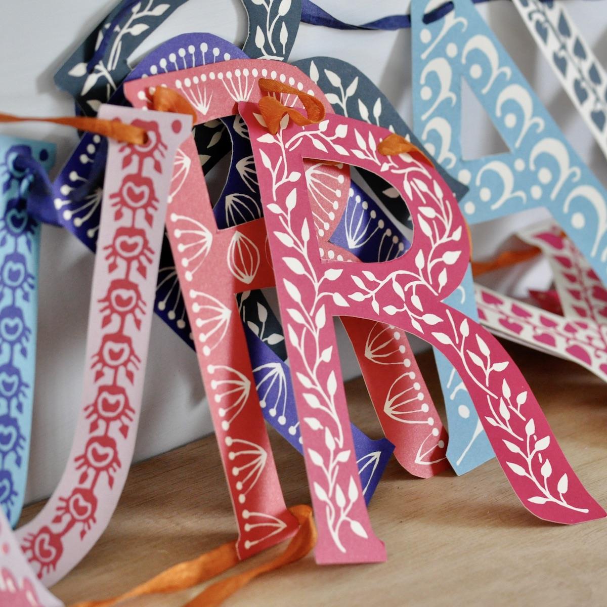 Twelve large double-sided patterned card letters which spell out HURRAY HURRAY with sixteen further star and flower ornaments. The letters are in assorted colours and designs, all with a strong folk art aesthetic, contained in a self-closing card wallet for long-term storage—string together on yarn or ribbon of your choice The letters are a generous 185 mm tall, and the garland makes a dramatic decorative feature. Makes approximately 2-3 metres of garland, depending on how closely the letters, flowers and stars are strung together. The thread is not included.