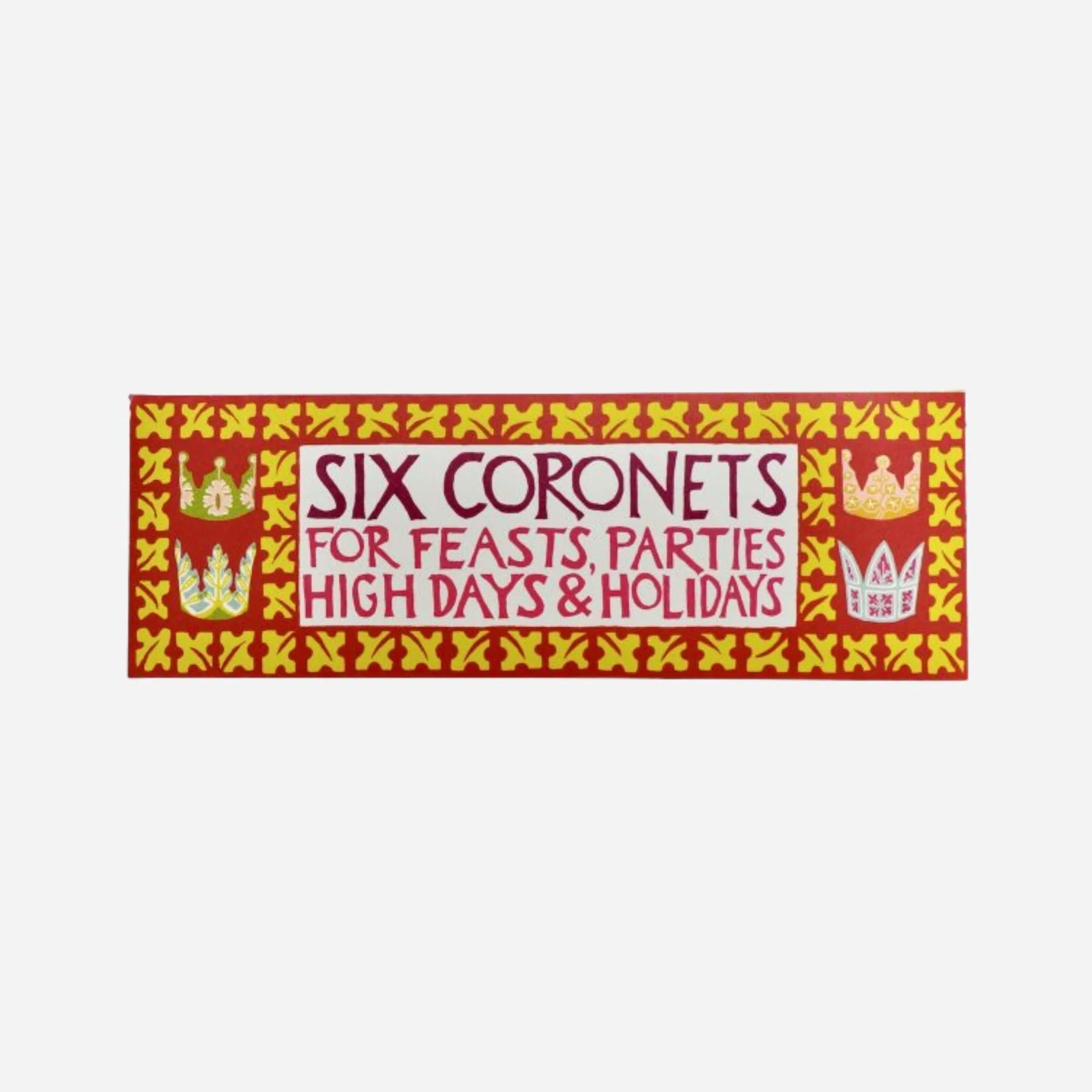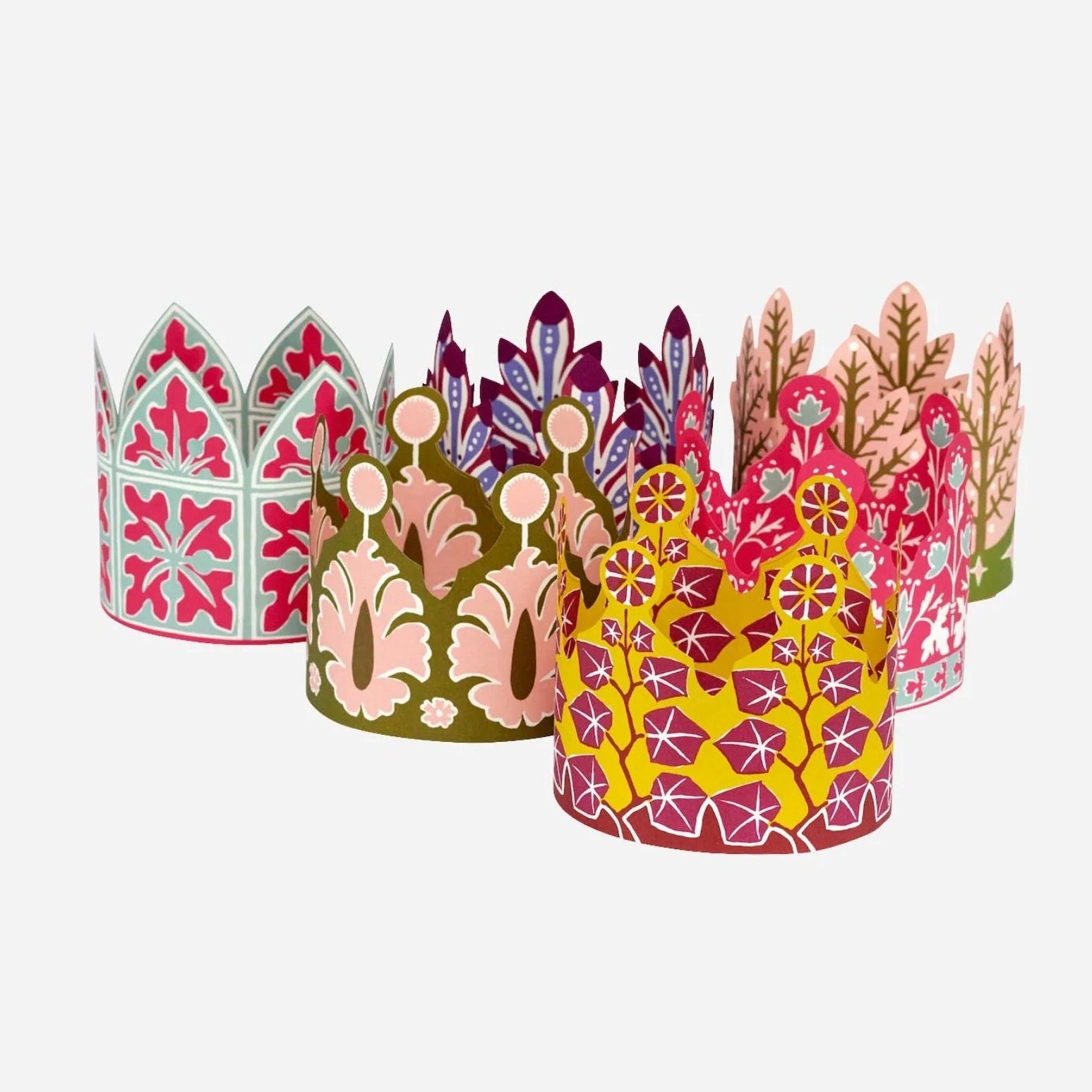 Six tall patterned coronets for feasts, parties, high days and holidays. Six Different Magnificent Designs. Never again will you be satisfied with one of those feeble tissue paper hats that come out of a cracker. Some minimal assembly is required, allowing the crown to be adjusted to the wearer's head size. Scissors and either glue or tape will be needed and are not included. Made in England from 90 gsm matte, uncoated responsibly sourced paper, printed with vegetable oil-based ink in hand-mixed colours. There is no glue, plastic or metal in the paper chain itself or the packaging: the entire product is fully biodegradable and recyclable.