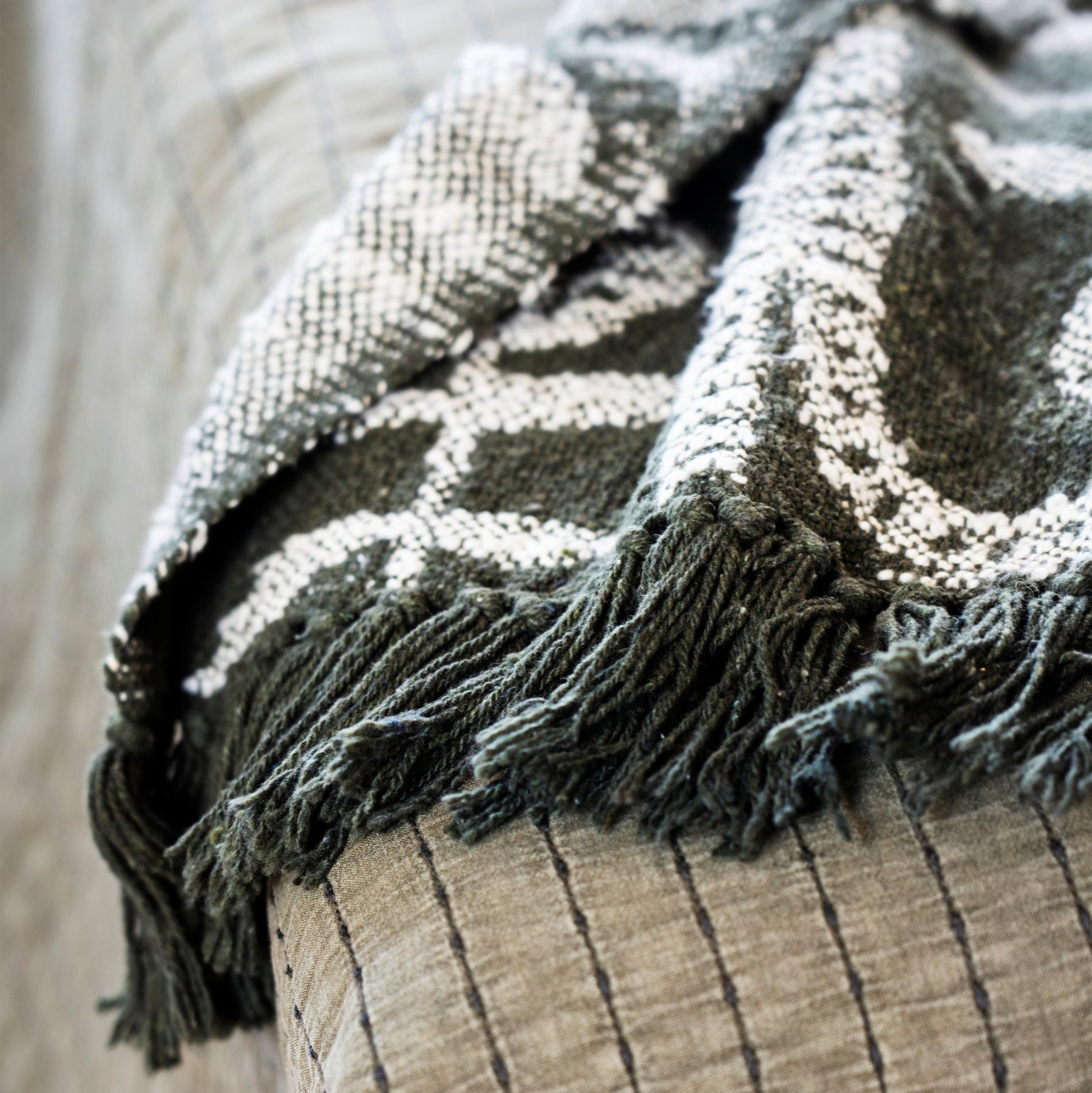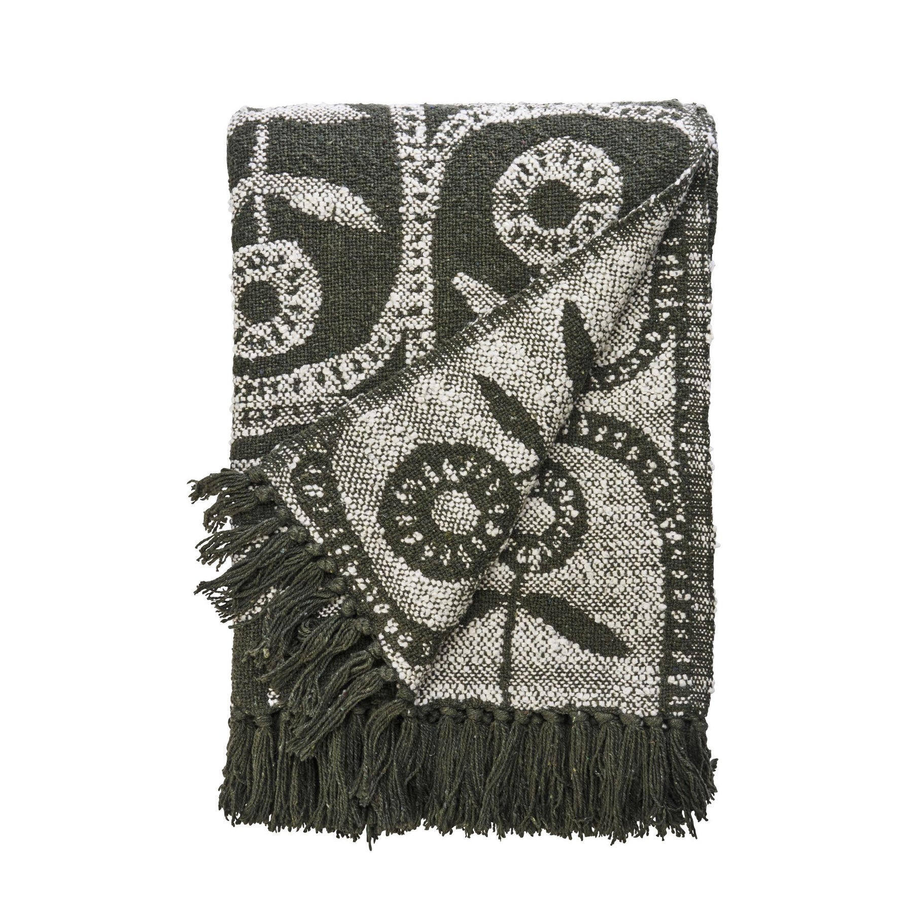 This throw is crafted from 100% recycled cotton, showcasing the expertise of skilled artisans in India. Each piece is handwoven, ensuring uniqueness and quality. The dark green and off-white colours form a classic combination, while the floral design is inspired by the bold graphic patterns of the 1950s.